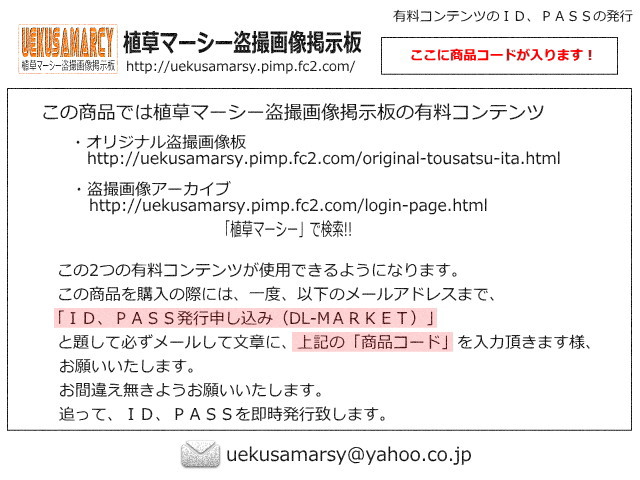 植草マーシー盗撮画像掲示板 http://uekusamarsy.pimp.fc2.com/植草マーシー有料コンテンツのID、PASS販売植草マーシー盗撮画像アーカイブ植草マーシーオリジナル盗撮画像アーカイブこの2つの有料コンテンツが利用可能な商品です。yahooやgoogleなどから、「植草マーシー」と検索してみてください。当サイトが1ページ目の1番上に表示されます。大変好評頂いているサイトです。・サイトからもID、PASSは申し込めますが、こちらで申請すれば各種クレジットカードにて決済できます。決済した後は一切料金は発生致しません。※こちらの商品をご購入後、画像に記された方法にてメールを送って頂き、即時発行となります。
